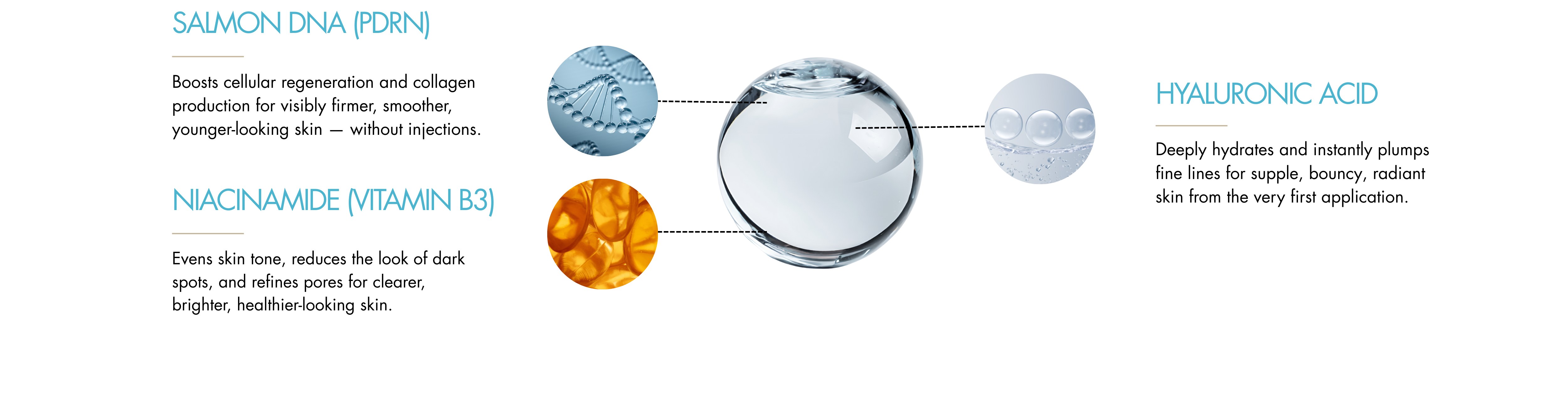- Salmon DNA (PDRN) + Hyaluronic Acid help smooth and plump skin